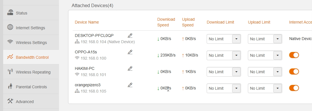 Next is to check the IP of this Orange Pi Zero 3 on your respective Router Admin Page, if you don't know how to try searching on Google with the keyword “Modem Model Admin Page” which is usually accessed using the Gateway IP Address. Here I use Tenda for access points, so I only need to visit http://192.168.0.1 then enter the password, on the bandwidth control menu there is the name “orangepizero3” which is the hostname of Orange Pi Zero 3, here Orange Pi Zero 3 gets IP 192.168.0.105.