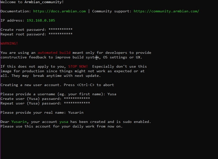 - Next, you are asked by the user to create an account that will be used to log in to Armbian, enter the Username and Password freely, but keep in mind.